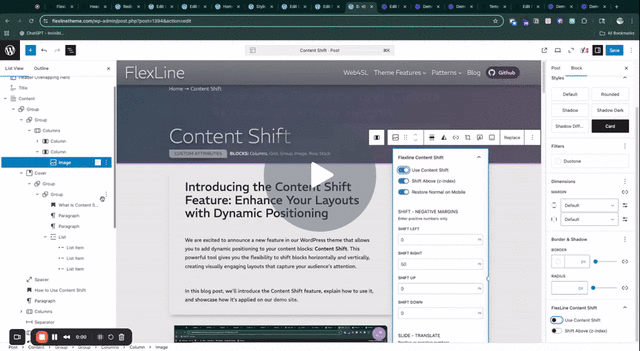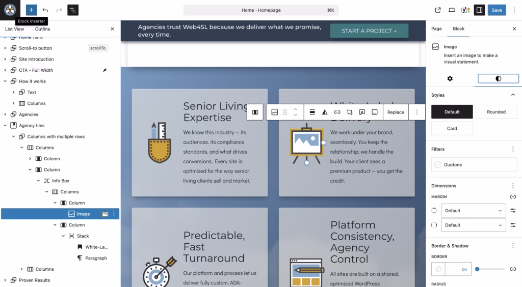 We engineered a new system within our FlexLine Theme called Content Shift, allowing controlled overlapping and offset positioning directly within the block editor. The enhancement introduced negative margin and translation options for any group, image, or layout element — all accessible through the native WordPress interface. This addition became a permanent feature of the FlexLine Theme, benefiting not just this project but all future Web4SL builds. With Content Shift in place, we executed the agency’s design precisely as envisioned — maintaining pixel-perfect fidelity while ensuring accessibility, speed, and long-term stability.